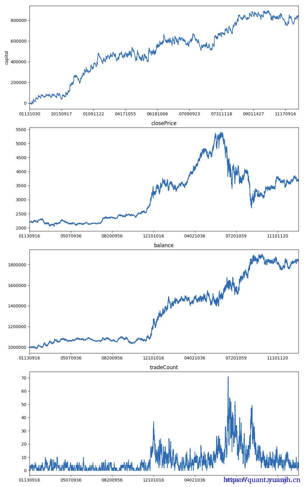 2019-04-07 20:17:45.237743 开始载入数据2019-04-07 20:17:45.298343 载入完成,数据量:1320262019-04-07 20:17:45.298398 开始回测2019-04-07 20:17:45.380278 策略初始化完成2019-04-07 20:17:45.380334 策略启动完成2019-04-07 20:17:45.380345 开始回放数据2019-04-07 20:18:01.712193 数据回放结束2019-04-07 20:18:01.712272 计算回测结果2019-04-07 20:18:01.810235 ------------------------------2019-04-07 20:18:01.810293 第一笔交易: 2014-01-13 10:30:002019-04-07 20:18:01.810320 最后一笔交易: 2015-12-31 15:15:002019-04-07 20:18:01.810373 总交易次数: 2,103.02019-04-07 20:18:01.810397 总盈亏: 845,985.782019-04-07 20:18:01.810418 最大回撤: -164,071.122019-04-07 20:18:01.810438 平均每笔盈利: 402.282019-04-07 20:18:01.810456 平均每笔滑点: 120.02019-04-07 20:18:01.810475 平均每笔佣金: 65.112019-04-07 20:18:01.810493 胜率 37.9%2019-04-07 20:18:01.810512 盈利交易平均值 9,815.462019-04-07 20:18:01.810531 亏损交易平均值 -5,342.222019-04-07 20:18:01.810549 盈亏比: 1.842019-04-07 20:18:07.159576 计算按日统计结果2019-04-07 20:18:07.932968 ------------------------------2019-04-07 20:18:07.933012 首个交易日: 2014-01-132019-04-07 20:18:07.933033 最后交易日: 2015-12-312019-04-07 20:18:07.933048 总交易日: 4822019-04-07 20:18:07.933063 盈利交易日 2472019-04-07 20:18:07.933076 亏损交易日: 2352019-04-07 20:18:07.933090 起始资金: 10000002019-04-07 20:18:07.933114 结束资金: 1,846,078.72019-04-07 20:18:07.933133 总收益率: 84.61%2019-04-07 20:18:07.933151 年化收益: 32.7%2019-04-07 20:18:07.933169 总盈亏: 846,078.72019-04-07 20:18:07.933187 最大回撤: -142,187.162019-04-07 20:18:07.933205 百分比最大回撤: -8.62%2019-04-07 20:18:07.933223 总手续费: 136,901.32019-04-07 20:18:07.933240 总滑点: 252,300.02019-04-07 20:18:07.933258 总成交金额: 4,563,376,620.02019-04-07 20:18:07.933276 总成交笔数: 4,205.02019-04-07 20:18:07.933294 日均盈亏: 1,755.352019-04-07 20:18:07.933311 日均手续费: 284.032019-04-07 20:18:07.933328 日均滑点: 523.442019-04-07 20:18:07.933346 日均成交金额: 9,467,586.352019-04-07 20:18:07.933363 日均成交笔数: 8.722019-04-07 20:18:07.933381 日均收益率: 0.14%2019-04-07 20:18:07.933398 收益标准差: 1.34%2019-04-07 20:18:07.933415 Sharpe Ratio: 1.572019-04-07 20:18:09.036527 ------------------------------2019-04-07 20:18:09.036648 首个交易bar: 2014-01-13 09:16:002019-04-07 20:18:09.036726 最后交易bar: 2015-12-31 15:15:002019-04-07 20:18:09.036746 总交易bar: 1301362019-04-07 20:18:09.036781 盈利交易bar 553582019-04-07 20:18:09.036817 亏损交易bar: 569052019-04-07 20:18:09.036851 bar均盈亏: 6.52019-04-07 20:18:09.036872 bar均手续费: 1.052019-04-07 20:18:09.036891 bar均滑点: 1.942019-04-07 20:18:09.036910 bar均成交金额: 35,066.212019-04-07 20:18:09.036928 bar均成交笔数: 0.032019-04-07 20:18:09.036948 bar均收益率: 0.0%2019-04-07 20:18:09.036966 收益标准差: 0.08%回测的结果可视化