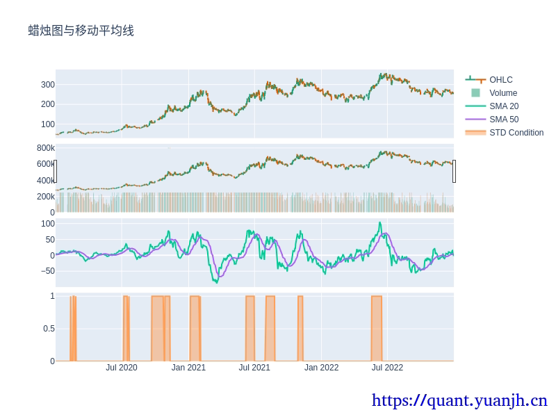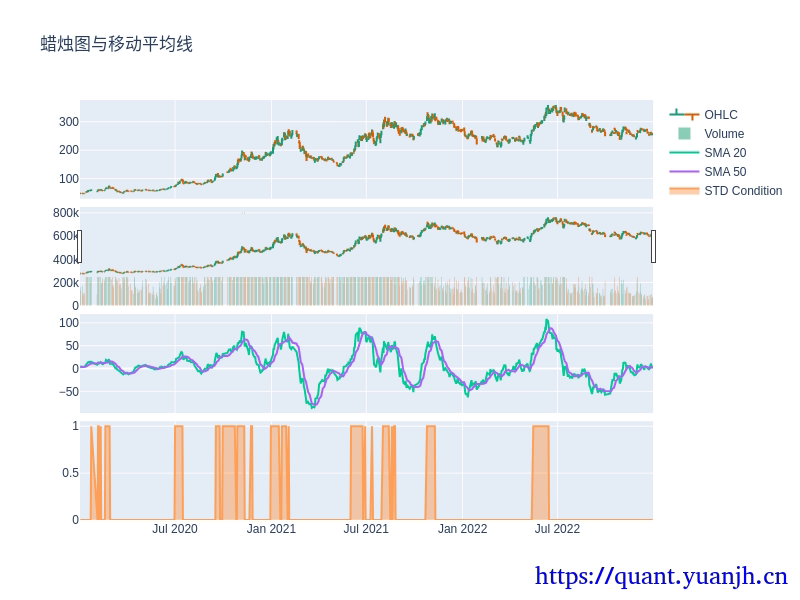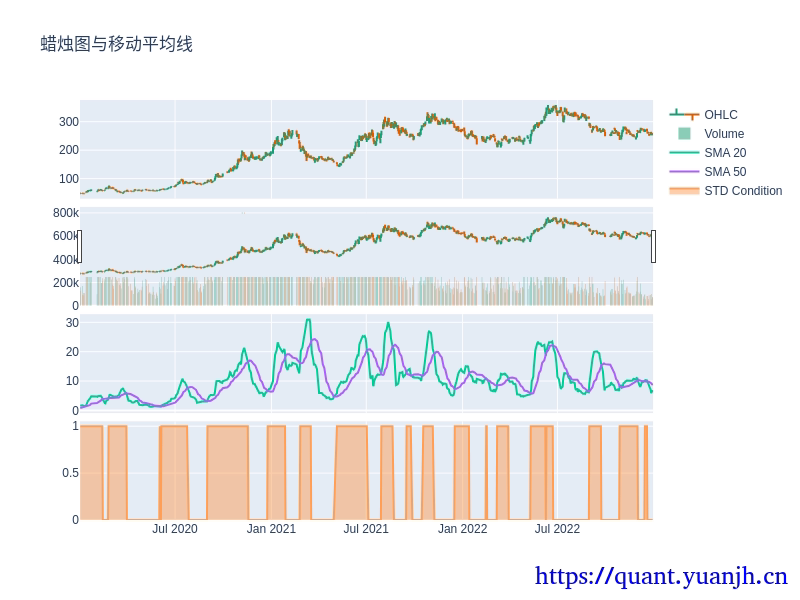 # 创建条件指标std_indicator = (std_close > std_close_ma ).astype(int)# 添加条件指标图fig.add_trace(go.Scatter(x=std_indicator.index, y=std_indicator, mode='lines', name='STD Condition', fill='tozeroy'), row=4, col=1)