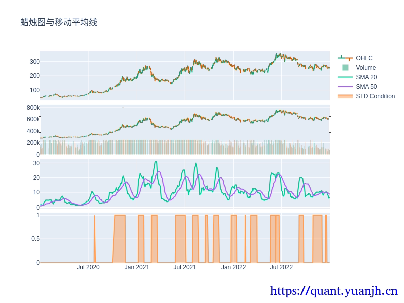 # 第二行添加两个移动平均线fig.add_trace(go.Scatter(x=ohlcv.index, y=std_close, mode='lines', name='SMA 20'), row=3, col=1)fig.add_trace(go.Scatter(x=ohlcv.index, y=std_close_ma, mode='lines', name='SMA 50'), row=3, col=1)