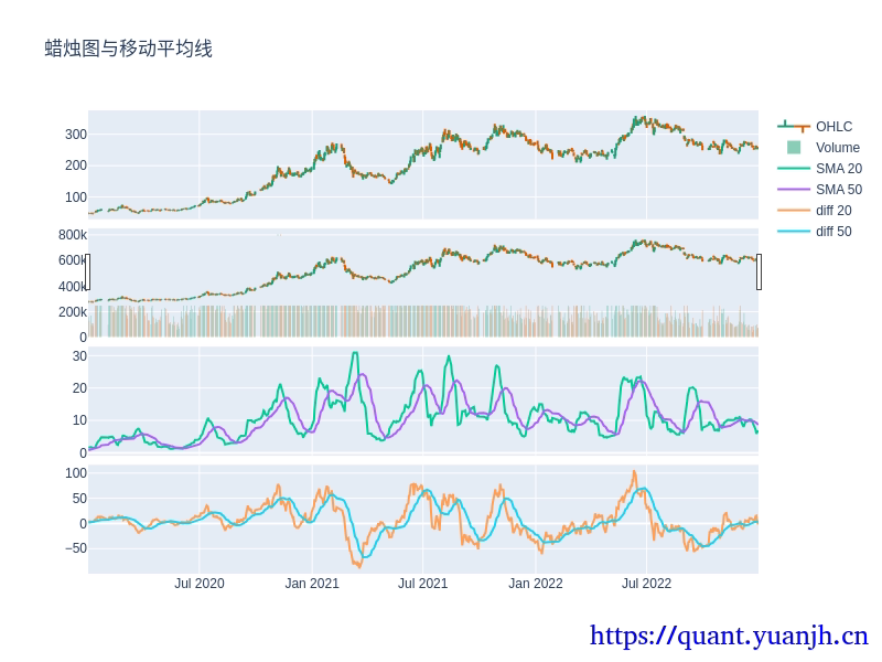 # 第二行添加两个移动平均线fig.add_trace(go.Scatter(x=ohlcv.index, y=diff_close, mode='lines', name='SMA 20'), row=3, col=1)fig.add_trace(go.Scatter(x=ohlcv.index, y=diff_close_ma, mode='lines', name='SMA 50'), row=3, col=1)